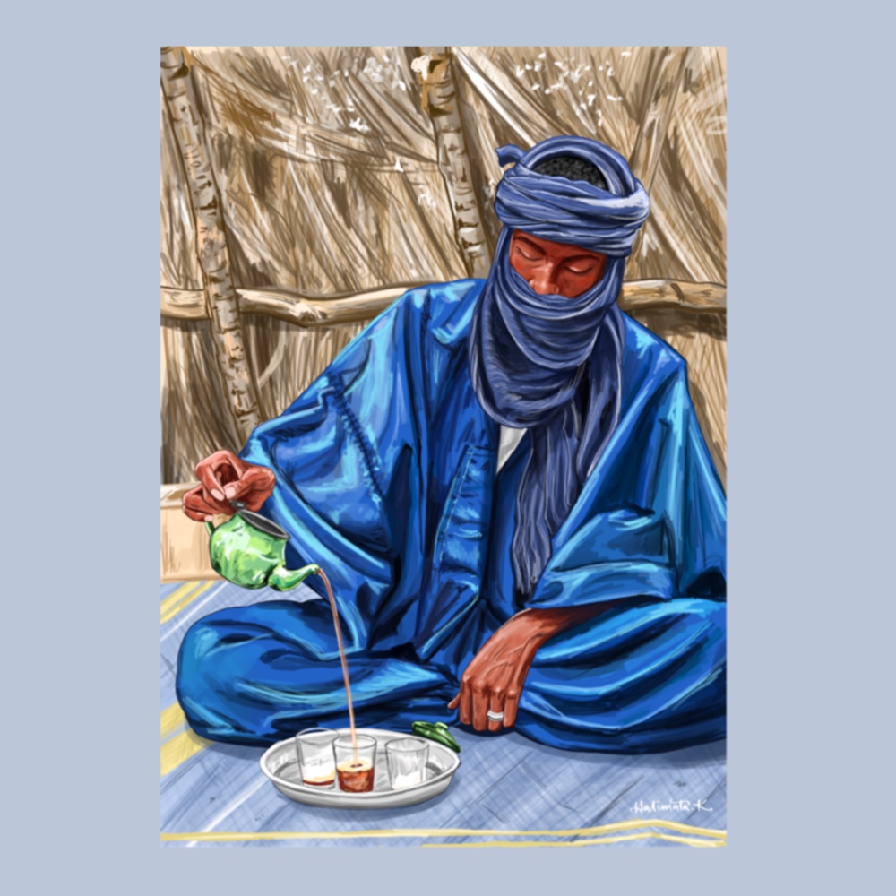 Un homme sahraoui en boubou bleu et son beau turban sert du Atay dans la cour. Un moment d’hospitalité et de partage, simple et beau à la fois.