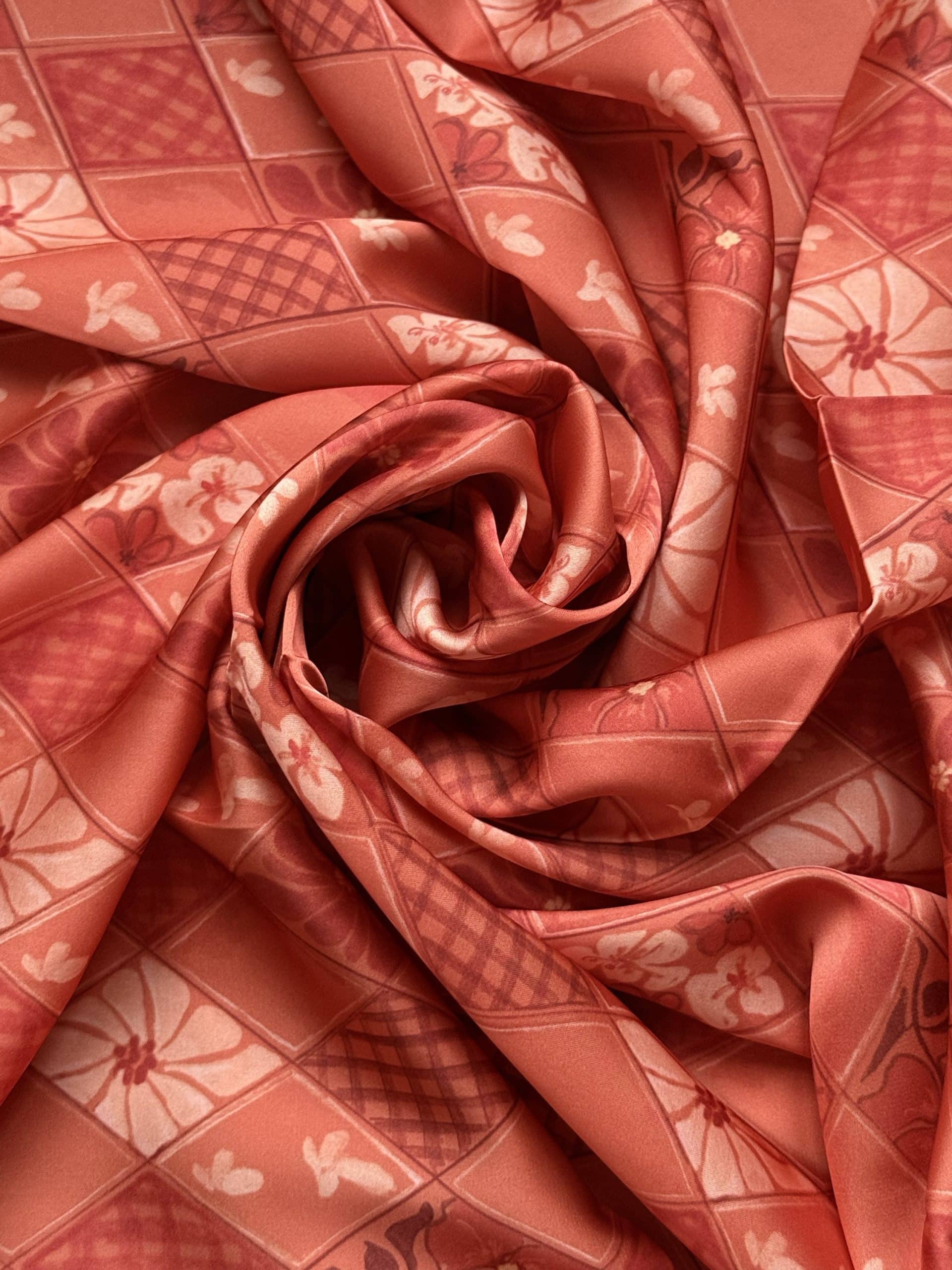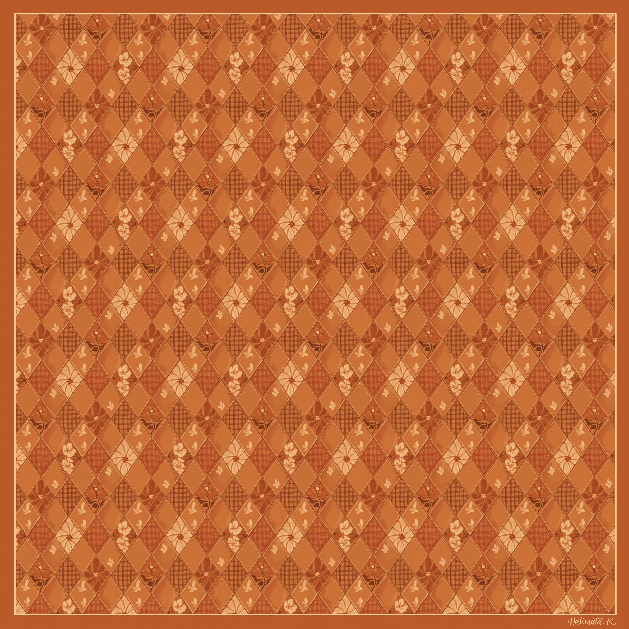 Ce carré est parti d’une couleur inspirée de l’automne. Un orange entre le vif et le terracotta. J’y ai ajouté les losanges structurés, parsemés de fleurs d’hibiscus qui viennent adoucir l’ensemble.