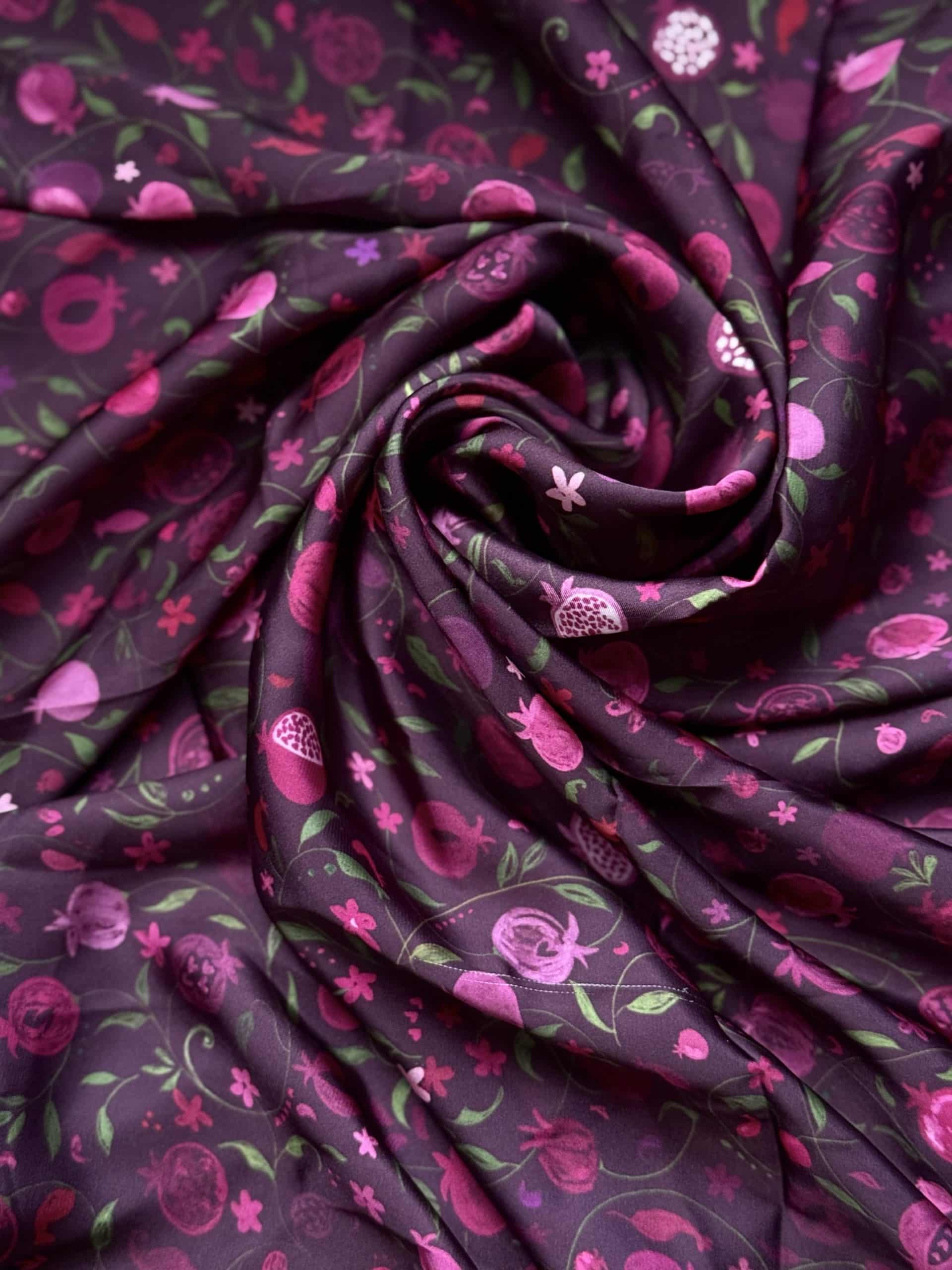Même motif que le rose, mais ici… tout change. En effet, la profondeur du prune se fondrait presque avec les grenades. Ce carré attire l’oeil à sa manière, il faut s’arrêter dessus pour remarquer les détails de cette oeuvre. Mystérieux et envoutant à sa manière… Il se porte à la fois avec des couleurs claires ou foncées.