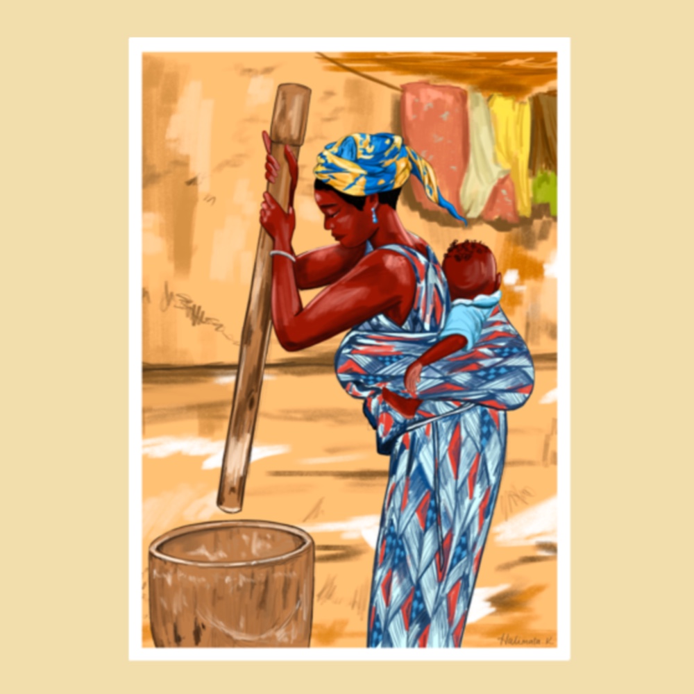 Un bébé sur le dos, un pilon dans les mains, elle cuisine devant la maison familiale. Entre deux gestes, elle surveille le linge qui claque dans le vent. La vie suit son rythme…
