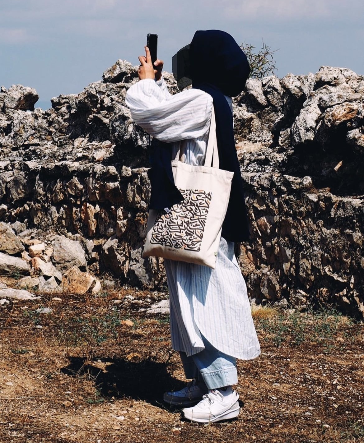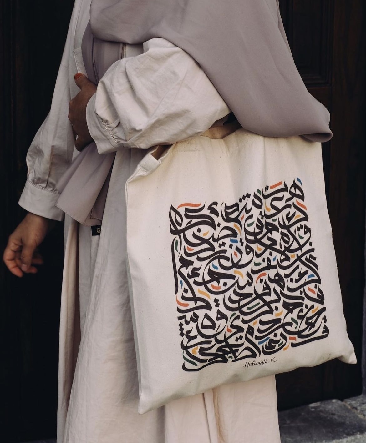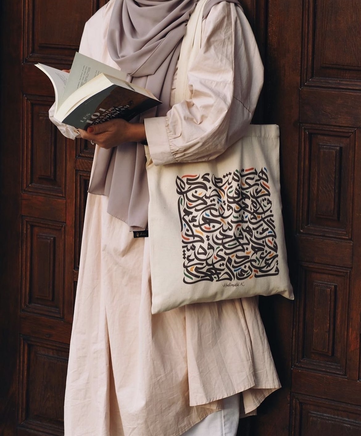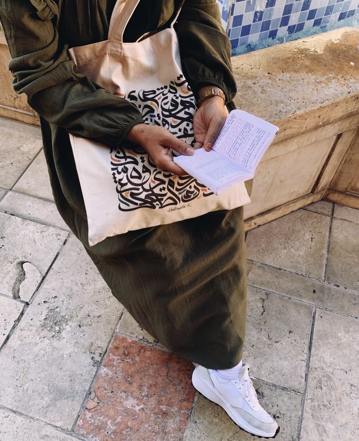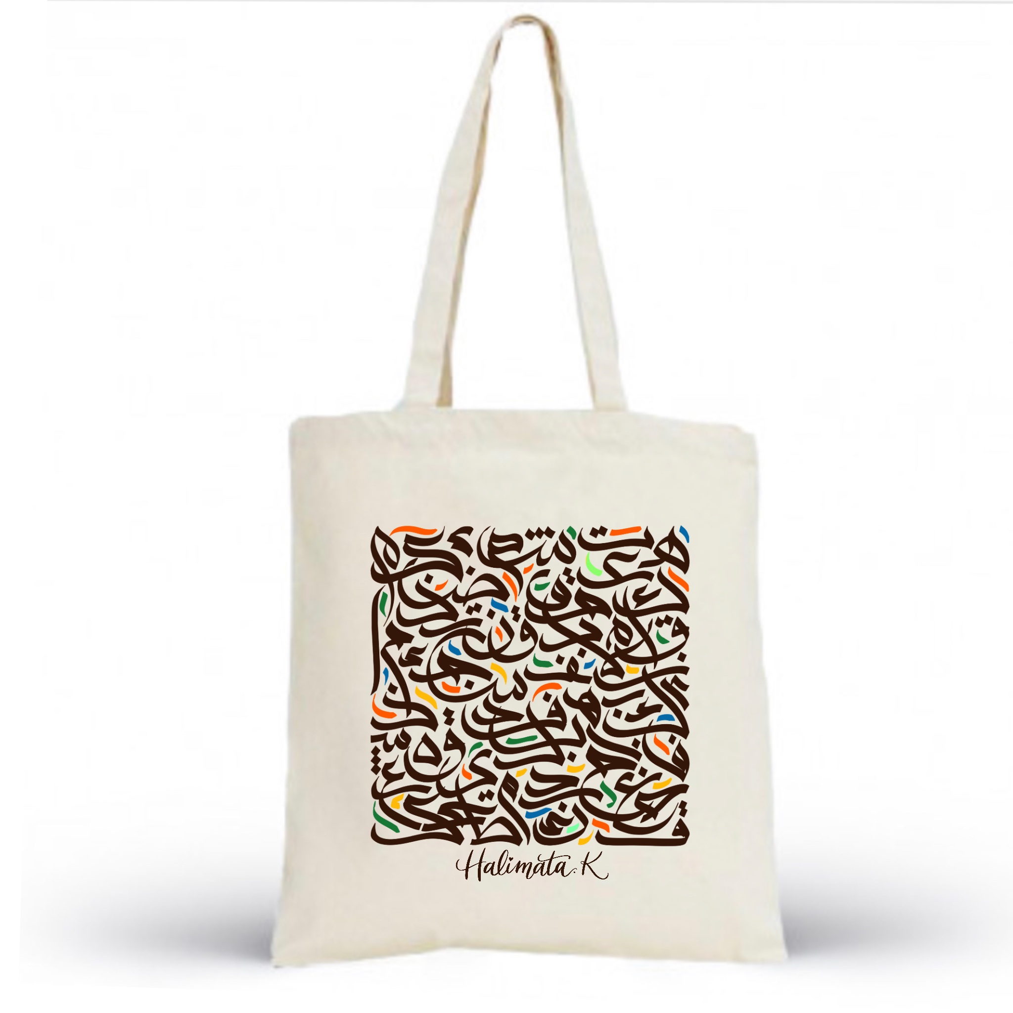 Pas de mot ou de phrase spécifique sur ce tote bag, mais un entremêlement de lettres de l’alphabet arabe.